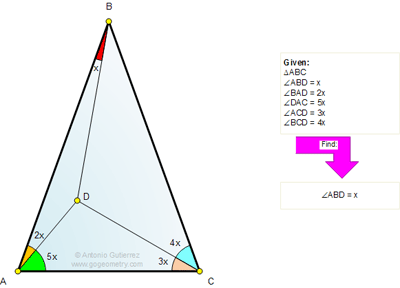 Since AO is the angle bisector of ang(BAG), then AG/OG = AB/OB. Comparing (1) and (2), we get sin 6x/cos 3x = sin x/cos 8x. From this trigonometric equation we obtain, successively, sin 6x.cos 8x = sin x.cos 3x, then sin 14x – sin 2x = sin 4x – sin 2x, then sin 14x = sin 4x. The hypothesis 14x = 4x is impossible. Hence 14x + 4x = 180º and x = 10º.
