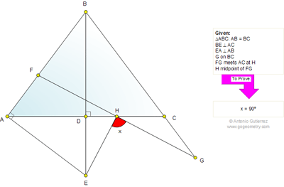 Online Geometry Problem 726: Isosceles Triangle, Perpendicular, Midpoint, 90 Degrees
