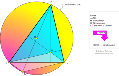 Problem 782: Triangle, Orthocenter, Circumcenter, Circumcircle, Diameter, Altitude, Parallelogram