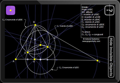 iPad Apps: Apollonius Software. Problem 794: Right Triangle, Altitude, Three Incenters, Circumcircles, Incircle, Congruence