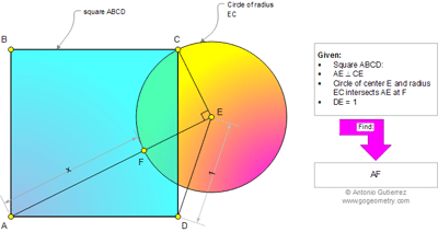 Delete<ACF=<DCE=45-<FCD, and <CDE=<CAF due to cyclic quadrilateral. Therefore X/CF=1/CE, X=CF/CE=sqrt2