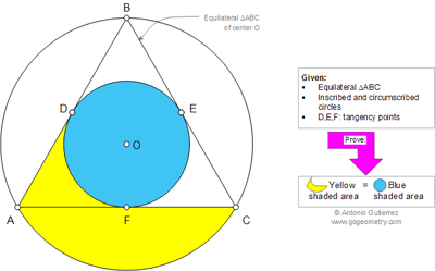 ReplyDeleteThe circumradius is double of the inradius in an equilateral triangle. Thus the blue area is 1/4 of the circumcircle. Since by symmetry, there are 3 equal yellow area, each of them must also be 1/4 of the circumcirlce.