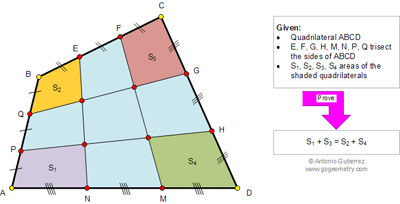 Geometry Problem 961. Quadrilateral, Trisection, Sides, Sum of Areas