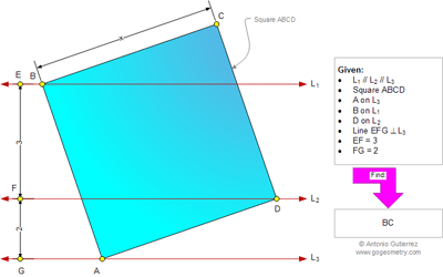Geometry Problem 973: Three Parallel, Square, Vertices, Distance Between Two Parallel Lines, Side, Metric Relations