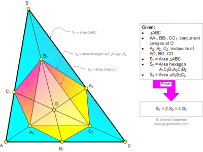 Geometry Problem 981. Triangle, Concurrent Cevians, Midpoints, Area, Hexagon