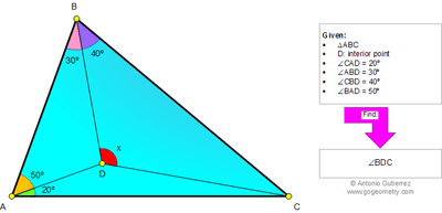 Geometry Problem 992: Triangle, Interior Point, Angles, 20, 30 , 40, 50 Degree