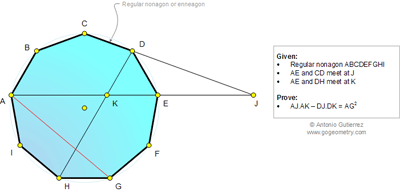 <KED=<KDE=1/2*3/9*360=60 so DEK is equilateral. <DAE=1/2*1/9*360=20 and <CDA=1/2*2/9*360=40 so ADJ is isosceles. AGD is also equilateral. Then AJ*AK=EJ*AJ=DJ*CJ=DJ(DJ+CD)