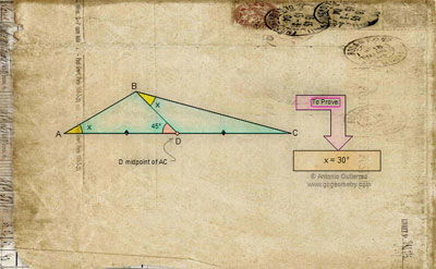 Problem 1, Art 01: Triangle, Angles, Midpoint, Congruence, 45 Degrees, Auxiliary Construction. PicSketch for iPad