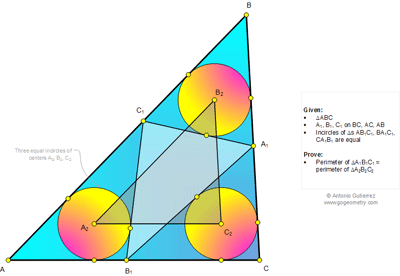 Geometry Problem 1034: Triangle, Three equal Incircles, Tangent lines, Isoperimetric triangles, Equal perimeter