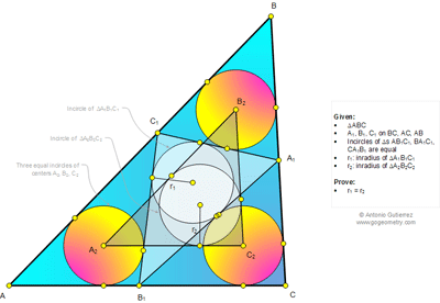 Geometry Problem 1036: Triangle, Three equal Incircles, Tangent lines, Inradius, Equal Inradii