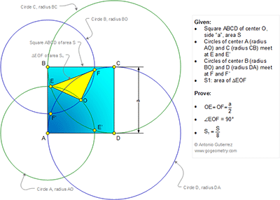 Circles centered B and D have symmetry axis BD so OF=OF’ => OE=OF= a/2