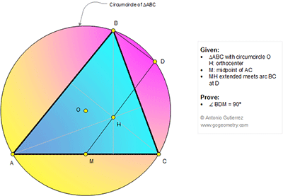 Online Math: Geometry Problem 1136: Triangle, Circumcircle, Orthocenter, Midpoint, Arc, 90 Degrees, Angle.