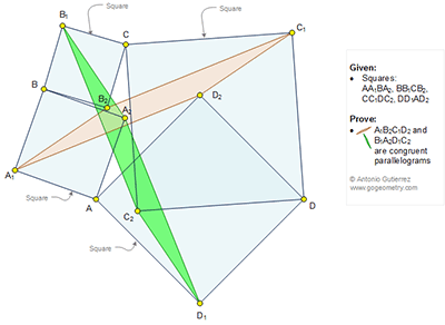 Geometry Problem 1202: Four Squares, Two Equal Parallelograms, Congruence