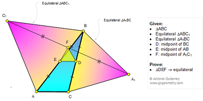 Midpoint of A1C1 is found by (a1 + c1)/2 = [e^i(pi)/3]*(c – b + b – a)/2 + (a + c)/2 = [e^i(pi)/3]*(c – a)/2 + (a + b)/2