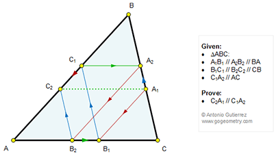 The coordinates for C indicate that A(C2) : (C2)B = B(A1) : (A1)C. Hence, line (C2)(A1) is parallel to line AC. Line AC is also parallel to line (C1)(A2), hence, line (C2)(A1) is parallel to line (C1)(A2).