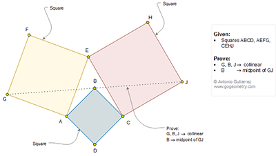 ReplyDeleteTriangle GAB=triangle AED (AG=AE,AB=AD,<GAB=90+<EAB=<EAD), so GB=ED and <GBA=<EDA.But triangle ECD=triangle JCB (EL=LJ,CD=CB, <ECD=<BCJ=90+<ECB ), so