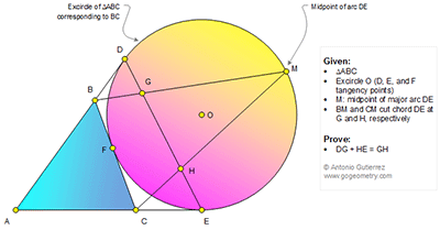 Geometry Problem 1317: Triangle, Excircle, Chord, Tangent, Midpoint, Arc, Sum of two Segments, Congruence.