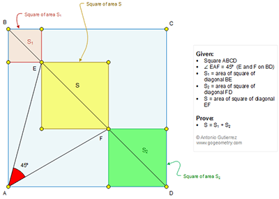 Geometry Problem 1338: Four Squares, Diagonals, Angle, 45 Degrees, Areas
