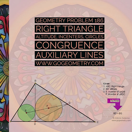 Geometric Art Typography and Sketch of Problem 186. Right Triangle, Altitude, Incenters, Circles, Auxiliary Lines, iPad Apps.