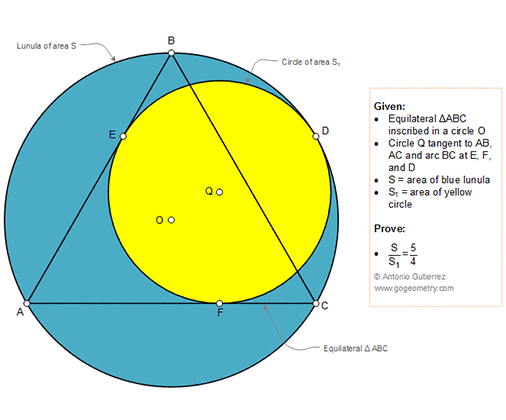 Geometry Problem 1362: Equilateral Triangle Inscribed in a Circle, Lunula, Ratio of Areas, Tangent, Sketch, iPad Apps