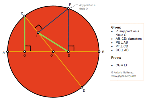 DeleteNote that F,O,E,P concylic, so by Sine rule, EF = OPsin<P = OCsin<COG = CG. done
