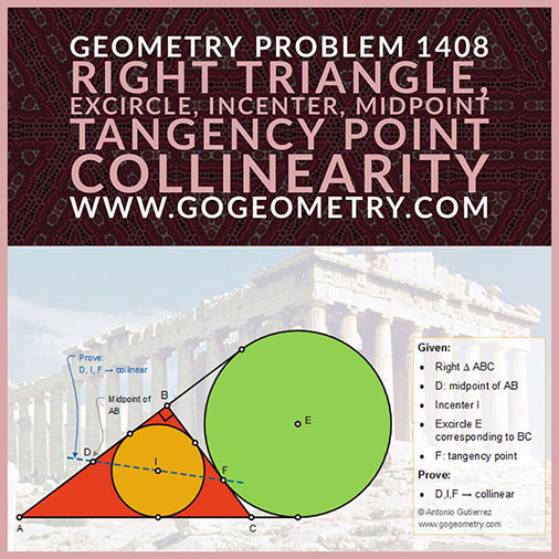 Geometric Art Typography of Geometry Problem 1408: Right Triangle, Incircle, Excircle, Incenter, Midpoint, Tangency Point, Collinearity, iPad Apps.