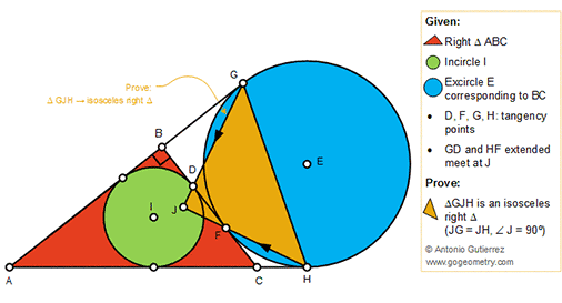 Geometry Problem 1411: Right Triangle, Incircle, Excircle, Tangency Points, Isosceles Right Triangle